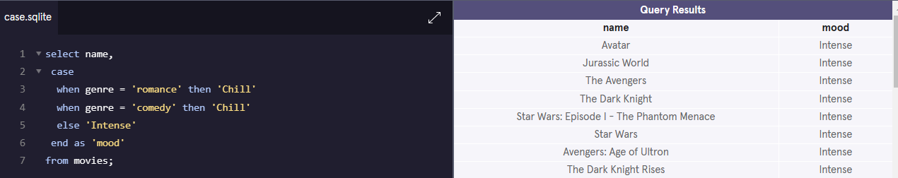 마지막에 end as 'mood'로 열 이름 설정 해줘야함.