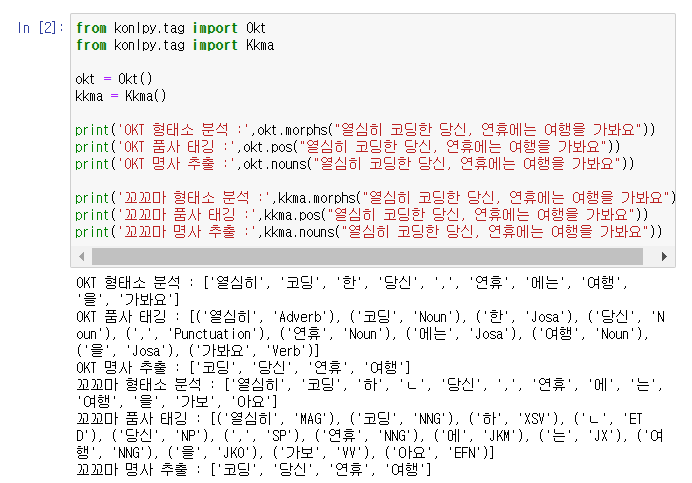 각 형태소 분석기는 성능과 결과가 다르게 때문에 용도에 따라 적절한 거 사용