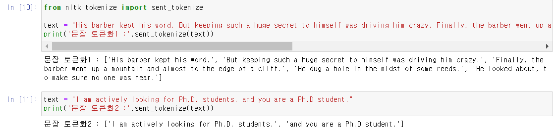 NLTK는 단순히 마침표를 구분자로 하여 문장을 구분하지 않음. Ph.D를 문장 내의 단어로 인식.