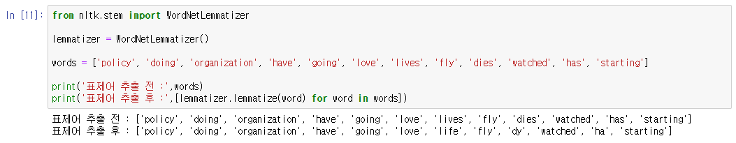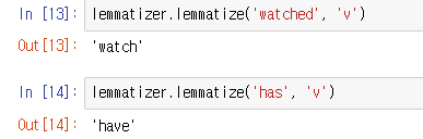 표제어 추출기가 본래 단어의 품사 정보를 알아야만 정확한 결과 얻을 수 있음
