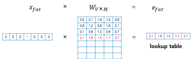 - V는 원-핫벡터이기 때문에 i번째만 1인 벡터. VW 는 W의 i번째 행을 그대로 읽어오는 것과 같은 의미