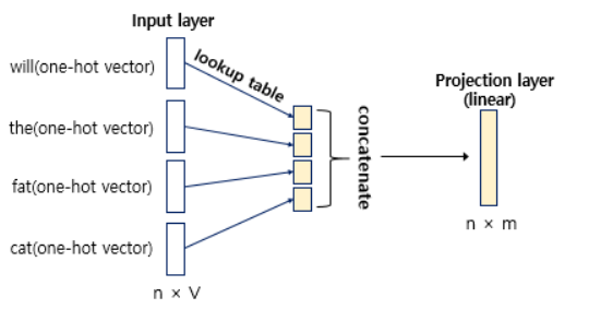 - 각 단어가 lookup table을 통해 임베딩 벡터(embedding vector)로 변경됨(투사층의 출력)