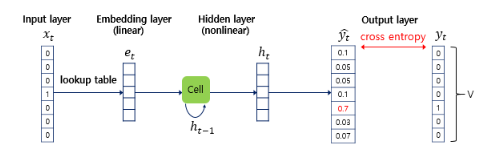 - t 시점의 단어의 원 핫 벡터가 들어옴