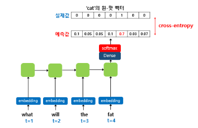 ex) what을 입력받으면, will을 예측하고 이 will은 다음 시점의 입력이 되어 the를 예측, the는 또 다시 다음 시점의 입력이 되어 fat을 예측
