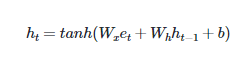 - 임베딩 벡터를 이전 시점의 은닉 상태인 h(t−1)과 함께 다음의 연산을 하여 현재 시점의 은닉 상태 h(t)를 계산