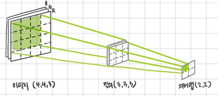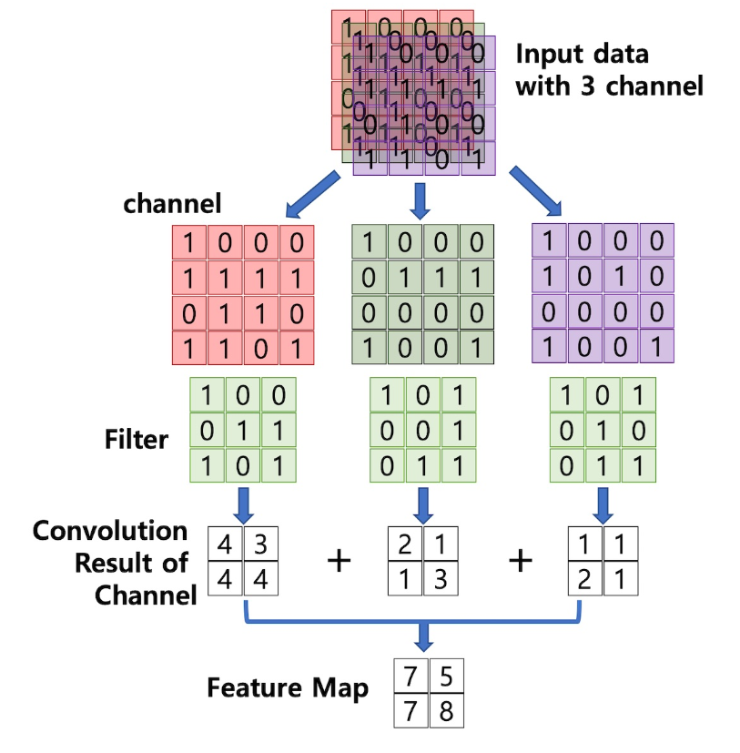 - 입력 데이터의 채널 수와 필터의 채널 수가 같아야 함