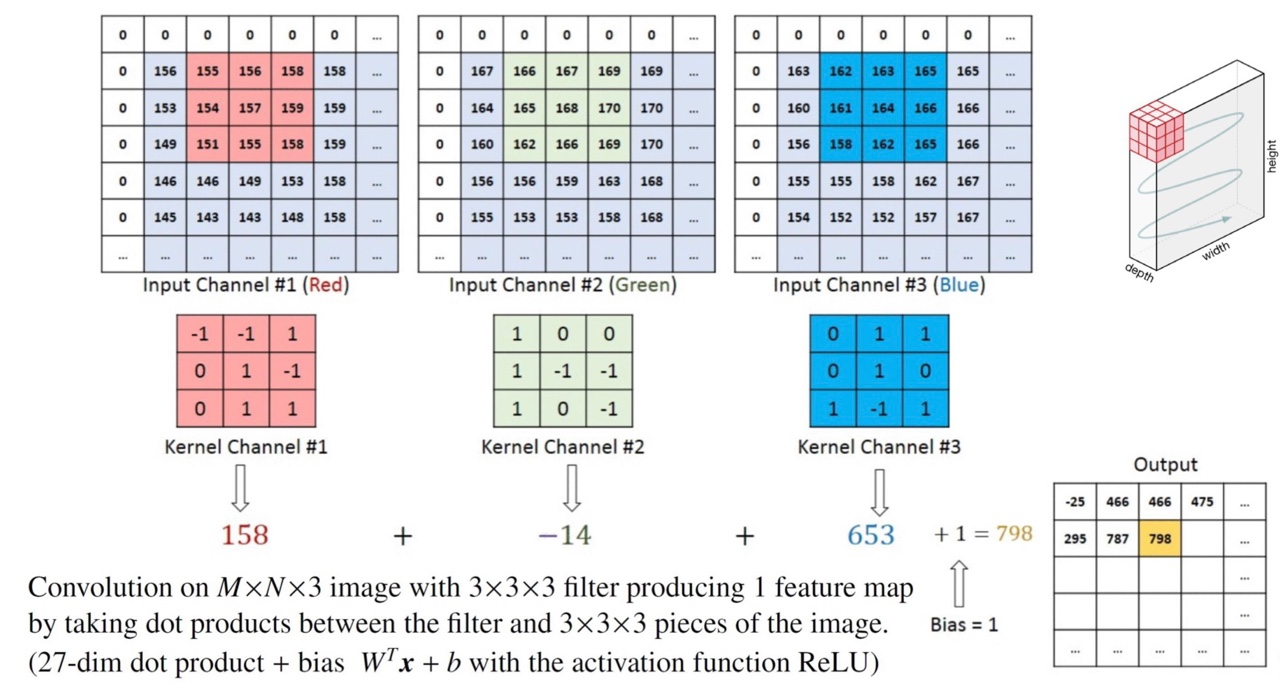 - 아래 그림은 M x N x 3인 input image에 3 x 3 x 3 filter(채널이 3인 필터)를 적용한 예시