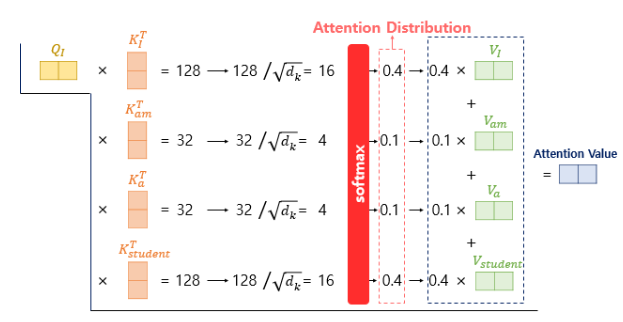 어텐션 스코어 값에 스케일링을 진행하고 그대로 소프트맥스 함수에 넣어서 어텐션 분포를 도출