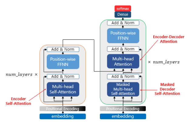 디코더층의 출력 벡터를 하나의 단어 벡터로 바꿀 때 이 두 가지 레이어가 사용됨!