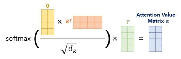 이 때 어텐션 함수로 내적만을 사용하지 않고 스케일링을 추가해서 계산하게 된다