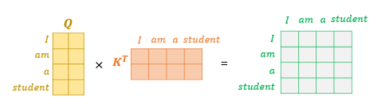 행렬의 각 원소가 Q,K벡터의 내적 즉 어텐션 스코어 값이 됨