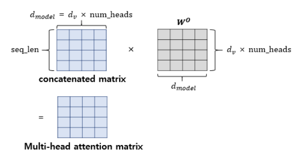 각 가중치 행렬은 d(model) x d(model)/num_heads 의 크기를 갖게됨
