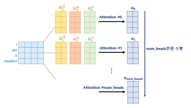 벡터의 차원을 num_heads를 통해 구한 차원으로 표현하기 위해서 학습 가능한 가중치 행렬을 곱해준다