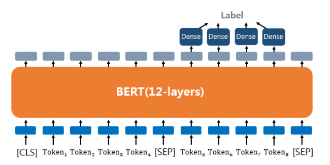 그리고 모델 출력이 정답레이블과 최대한 같아지도록 BERT레이어 전체를 포함해서 모델 전체를 업데이트 한다.